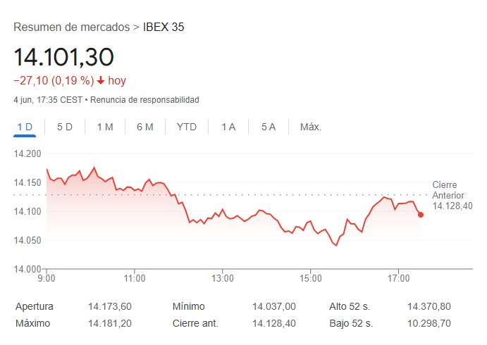 El Ibex 35 ha perdido un 0,19% en la sesión del miércoles, situándose al cierre en los 14.101,3 enteros, en un contexto marcado por los nuevos episodios de la guerra comercial.